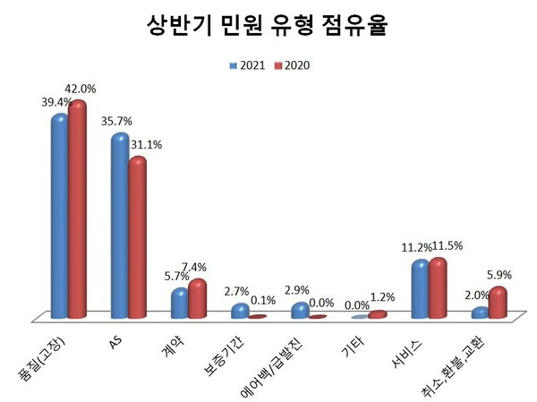 5개 업체 모두 품질과 AS에 불만이 50% 이상 쏠렸고 이어 서비스센터 응대나 고객센터 등 응대에 불편을 느꼈다는 민원이 10% 이상 제기됐다.