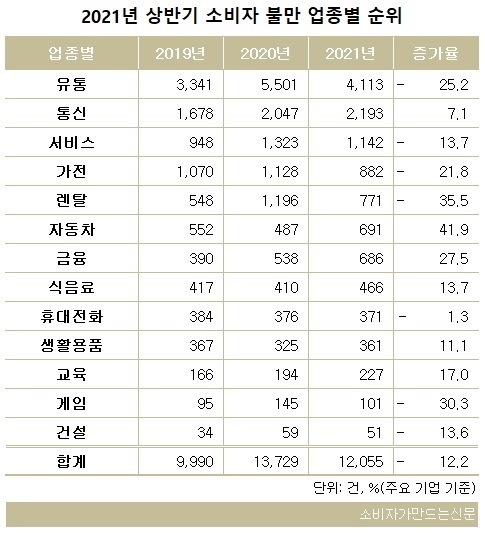 13개 업종 중 온라인몰, 홈쇼핑, 대형마트, 편의점 등이 포함된 유통의 상반기 총 제보 건수는 4113건으로 지난해(5501건)보다 25.2% 급감했다.