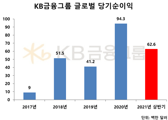 실제 실적에서도 가시적 성과를 거두고 있다. 최근 5년 간 KB금융의 글로벌 당기순이익은 지난 2017년 900만달러에 불과했지만 지난해 9430만달러로 3년 새 10배 이상 늘었다. 올해 상반기 당기순이익만 6260만달러로 지난해 전체의 66.4%를 이미 반년 만에 달성했다.