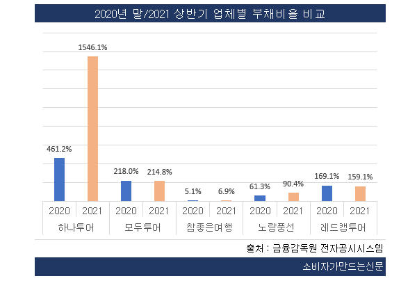 31일 금융감독원 전자공시시스템에 따르면 하나투어의 부채비율은 461.2%에서 1546.1%로 1084.9%p 상승했다. 부채 총계는 크게 변하지 않았고 국내 자회사와 해외 법인을 정리하며 자본 총계가 감소해 부채비율이 높아졌다는 게 회사측 설명이다.