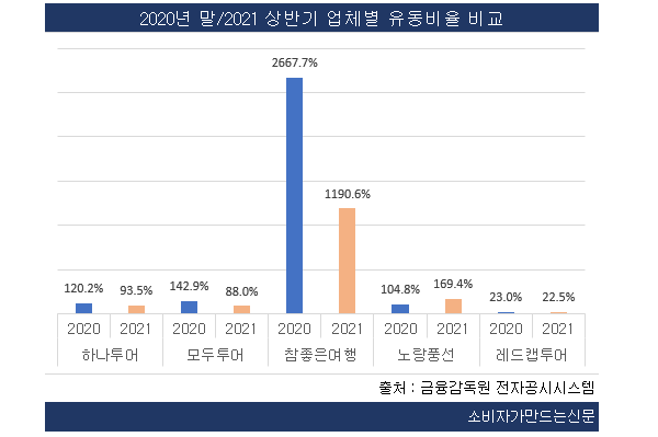 모두투어 관계자는 “상반기 유동부채는 증가했지만 비유동부채는 감소해 결국 부채가 갖는 속성만 바뀐 것”이라며 “현재 해당 부채에 대해 단기 상환해야 하는 이슈도 크지 않아 재무 건전성에 문제가 되진 않을 것”이라고 밝혔다. 반면 중위권 여행사들은 비교적 안정적인 유동비율과 부채비율을 유지하고 있다.