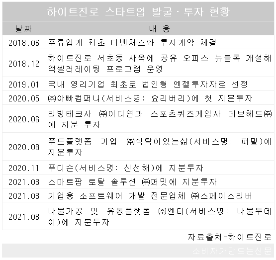 하이트진로는 2019년 국내 영리기업 최초로 법인형 엔젤투자자로 선정된 이후 식품, 스마트팜, 소프트웨어 개발 업체 등이 스타트업을 발굴해 투자하고 있다.