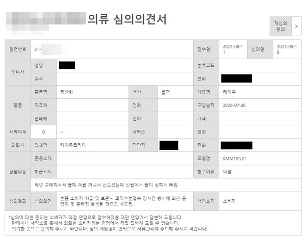 한국소비자원 관계자는 분쟁 발생 시 섬유·신발제품 심의위원회에 제품 심의를 접수하면 해결 받을 수 있다고 제언했다.