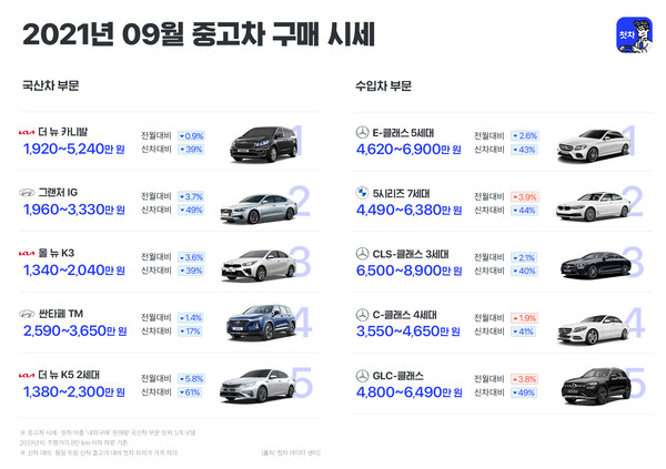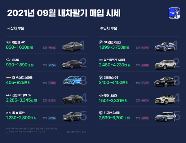 모바일 중고차 플랫폼 '첫차'가 9월 인기 중고차 구매가와 매입가에 대한 예상 시세를 공개했다.