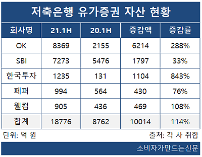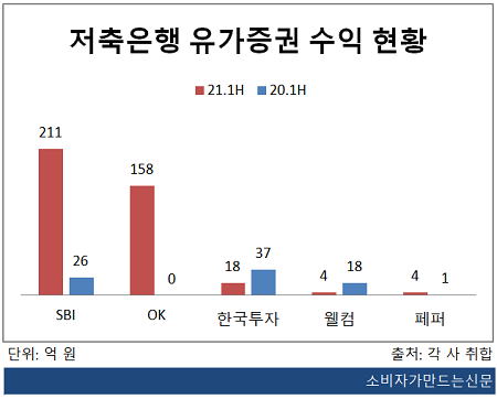 유가증권 투자는 저축은행 상반기 실적호조에 보탬이 됐다. 올해 상반기 저축은행 5사의 당기순이익은 총 4881억 원으로 전년 동기 3307억 원 대비 48%(1574억 원) 증가했다.