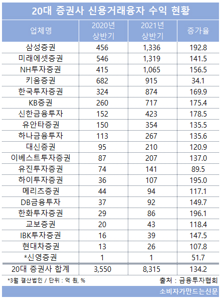 3일 금융투자협회에 따르면 자기자본 기준 20대 증권사의 올해 상반기 신용거래융자 수익은 8315억 원으로 지난해 상반기 3550억 원에 비해 134.2% 폭증했다.