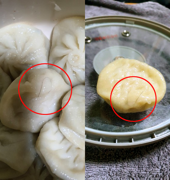 전라남도 영암군에 사는 배 모(남)씨는 지난 22일 마트에서 구입한 냉동만두를 찜기에 찐 후 먹으려던 찰나 만두피에 머리카락이 박힌 만두 2개를 발견했다. 다른 만두에는 이물이 없었으나 찝찝한 마음에 식사를 중단할 수밖에 없었다.