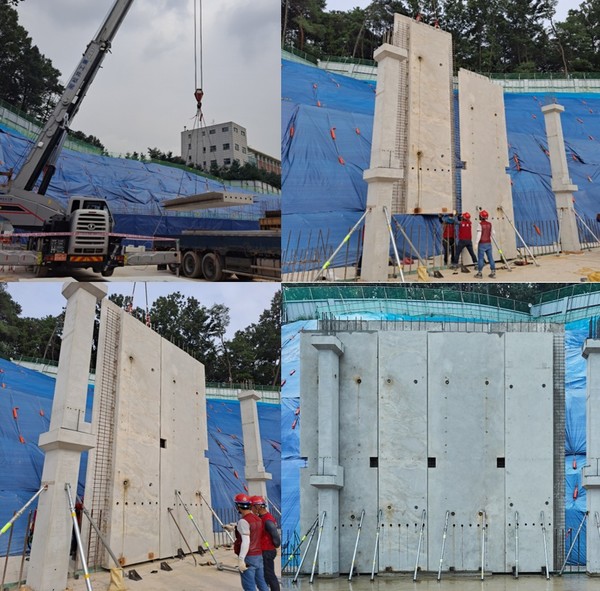 또 지금까지의 PC공법은 기둥 및 보, 슬래브 등 주요 골조와 정형화된 모듈구간에만 적용되다 보니, 적용 범위가 상대적으로 낮았다. 한화건설의 지하외벽 PC공법은 PC벽체를 공장에서 생산한 후 현장반입, 조립 및 접합부 콘크리트 타설 등의 공정으로 완성되는 조립식 공법으로 주차장 모듈과 상관없이 비정형 구간에도 설치 가능하다. 또 현장타설을 위한 별도의 거푸집이 불필요해 공사 기간을 단축할 수 있다.