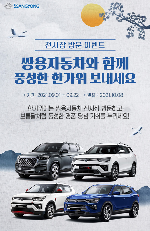 이번 이벤트 참여 방법은 전시장을 방문하여 응모권을 작성∙제출하거나 쌍용자동차 홈페이지(이벤트)에서 온라인 구매 상담을 신청하면 자동 응모된다. 추첨을 통해 ▲아이캠퍼 아웃도어 키친세트(10명) ▲북유럽풍 면타프(90명) ▲쌍용어드벤처 코란도 블록세트(200명) ▲스타벅스 커피교환권(700명) 등 총 1000명에게 푸짐한 경품을 제공한다.