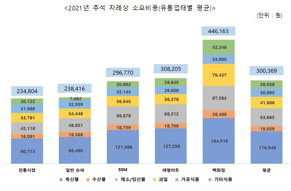 전통시장은 대형마트보다 평균 소요비용이 7만3401원(23.8%) 더 적게 드는 것으로 나타났다. 그러나 가공식품은 대형마트가 전통시장보다 평균 9.3% 더 저렴했다.