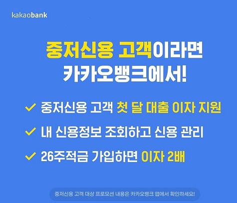 카카오뱅크는 다음달 9일까지 '중신용대출' 또는 '중신용 플러스 대출' 등을 신규로 받은 중저신용 고객(KCB기준 820점 이하)에게 첫 달 이자를 지원한다. 한 달 이자는 고객 본인 명의의 카카오뱅크 계좌로 지급되며 별도로 응모하지 않아도 된다는 설명이다.