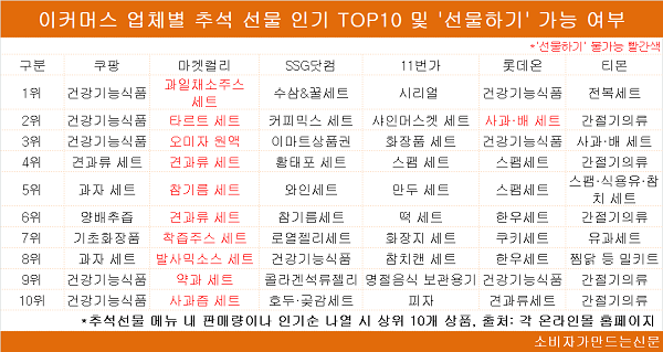 업체별 추석 선물 인기 순위와 선물하기 가능 여부를 보면 마켓컬리와 롯데온을 제외하고는 모두 10위까지의 상품들에 대해 선물하기 서비스로 이용할 수 있다.