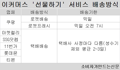 선물하기 서비스 이용 시 배송지를 사전에 알 수 없기 때문에 업체 대부분이 택배 배송만 가능하다. 날짜를 지정해서 배송하는 예약 배송도 불가능하다.