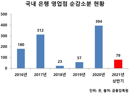 올해 상반기 말 기준 국내 은행 영업점은 전년 말 대비 79곳 줄어든 6326곳이었다. 11개 점포가 신규 출점했고 90개 점포가 인근 영업점과 통·폐합되며 사라졌다. 하반기 통·폐합이 예정된 영업점을 감안하면 올해도 수 백여 곳이 사라질 전망이다.