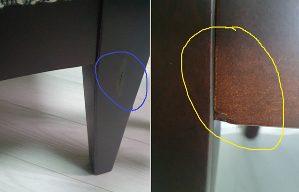 다리 부분에 패인 흔적은 물론 군데군데 스크래치도 있어 도저히 새상품으로 볼 수 없었다고. 온라인몰 고객센터에 수차례 항의했으나 담당자는 "판매자와 전화통화가 안 돼 문자로만 연락할 수 있다"고 해 화를 돋웠다. 우여곡절 끝에 연락이 닿은 판매자는 "AS만 가능하다"고 선을 그었다.