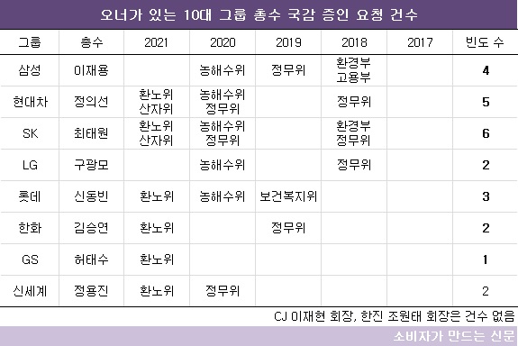 소비자가 만드는 신문이 매년 10월께 열리는 국정감사를 앞두고 국회로부터 증인 출석 요구를 받은 10대 그룹 총수를 조사한 결과 최태원 SK 회장이 6건으로 가장 많았다.