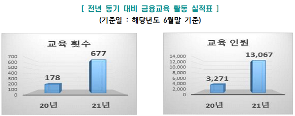 올해 7월 말 기준 비대면 금융교육 횟수는 73회, 참여인원은 2055명에 달했다. 대면 교육을 포함한 전체 금융교육 활동 실적도 올해 6월 말 기준 전년 대비 3.8배 증가한 677건, 교육인원은 4배 늘어난 1만3067명으로 코로나 팬데믹에도 오히려 활발한 금융교육 활동이 이뤄지고 있다.