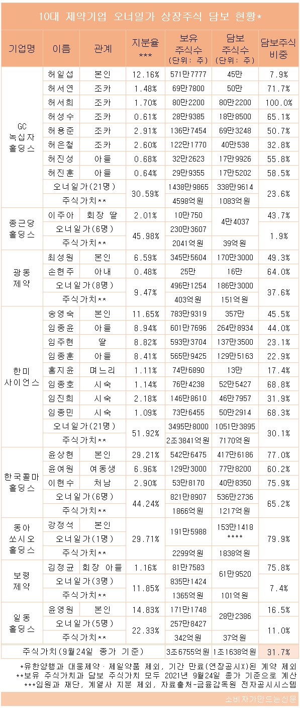 금융감독원 전자공시시스템에 따르면 오너일가 지분이 없는 유한양행을 제외한 매출 상위 상장 제약기업 10곳 중 오너일가가 보유 주식을 담보로 대출을 받은 곳은 총 8곳으로 나타났다. 대웅제약과 제일약품은 전 상장 계열사를 통틀어 오너일가 주식담보 대출이 없었다.