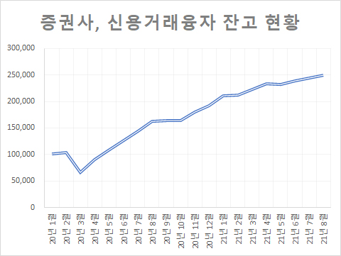 지난해 초만 하더라도 증권사 신용거래융자 잔고는 10조 원 대였으나 하반기부터 크게 증가해 지난해 12월 19조 원을 넘어섰다. 올해 1월 21조 원을 돌파한 이후 매달 늘어 9월23일 기준 25조3536억 원을 기록했다.