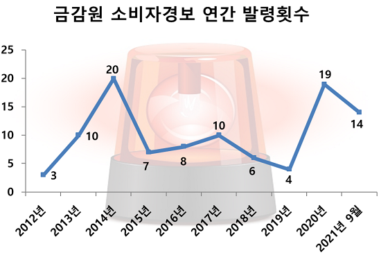 금감원은 제도 개선을 위해 지난해 소비자 경보 발령 기준에 종전 정량적 기준에 추가로 정성적 기준을 더했다. 그 결과 2020년 19건에 이어 올해 9월 말까지 14건이 발령됐다.