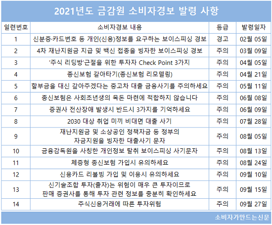 코로나19 관련 소비자 피해 우려 사안에 대해서도 지난해부터 적극적으로 소비자 경보를 발령하고 있다. 올해도 '재난지원금' 관련 대출사기 및 보이스피싱 피해 방지를 위해 지난 3월과 8월 두 차례에 걸쳐 소비자 경보를 발령한 바 있다.