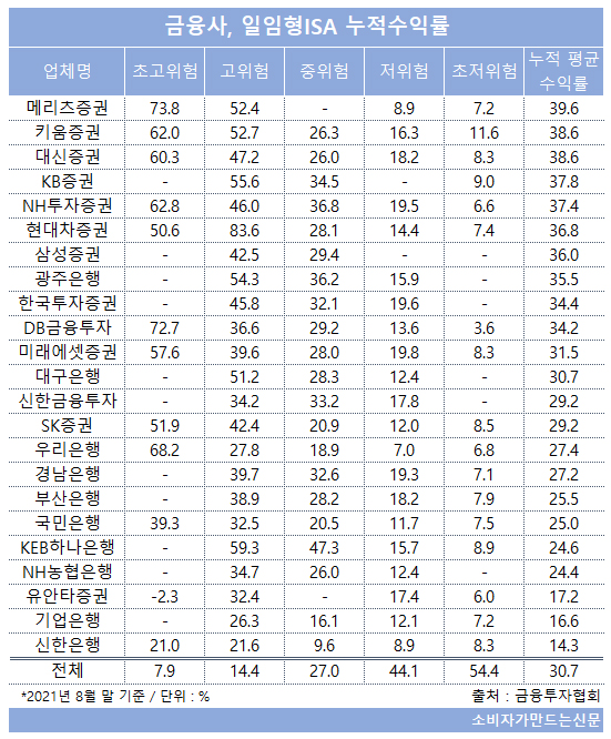 메리츠증권은 40% 육박하는 수익률을 기록했으며 대다수 증권사들도 30%대 수익률로 상위권에 포진했다. 은행은 수익률 30%대를 기록한 광주은행과 대구은행을 제외하면 대부분 10~20%대에 머물렀다.