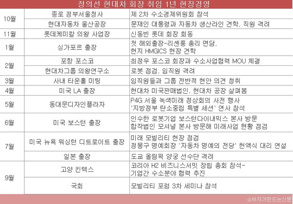 정 회장은 취임 직후부터 자율주행, 로봇 등 신 사업에 수조 원 대 과감한 투자를 결정했고 미래 모빌리티 생태계 확대를 위해 정·재계 인사와도 잇달아 만났다.  관련된 국내외 출장과 행사 참석 등 숨 가쁜 일정을 소화했다.