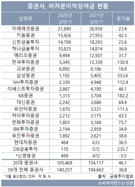 금융투자협회에 따르면 국내 59개 증권사의 올해 상반기 미처분이익잉여금은 19조4663억 원으로 전년 동기 14조257억 원 대비 38.8% 급증했다.