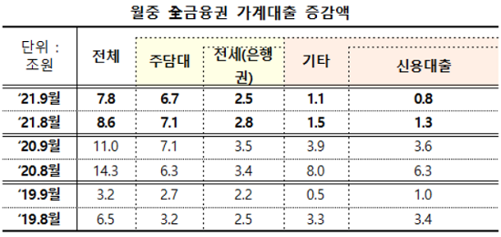 대출 종류별로는 주담대 증가분이 전월 대비 4000억 원 감소한 6.7조 원, 신용대출도 제2금융권을 중심으로 전월 대비 5000억 원 감소한 8000억 원이었다.