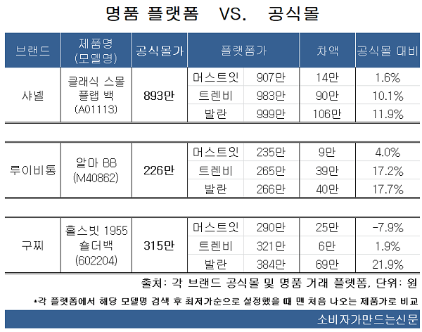 샤넬 제품(클래식 스몰 플랩백, 모델명 A01113)은 공식몰에서 가격이 893만 원이었지만 명품 플랫폼에서 최대 106만 원까지 차이가 났다. 발란에서는 11.9%(106만 원) 더 비싼 999만 원에 판매 중이었고 트렌비와 머스트잇도 각각 983만 원(10.1%), 907만 원(1.6%)으로 공식몰보다 비쌌다.