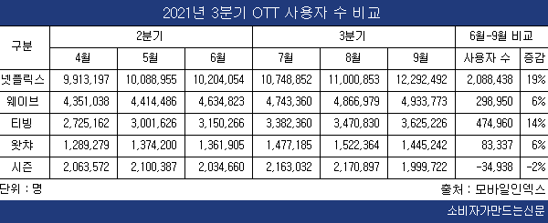 토종 OTT 1위 업체인 웨이브도 꾸준한 성장을 이어갔다. 3분기 동안 29만8950명의 사용자가 증가하며 6% 성장했다. 웨이브 역시 이같은 꾸준한 성장의 주 요인으로 오리지널 콘텐츠를 꼽았다.