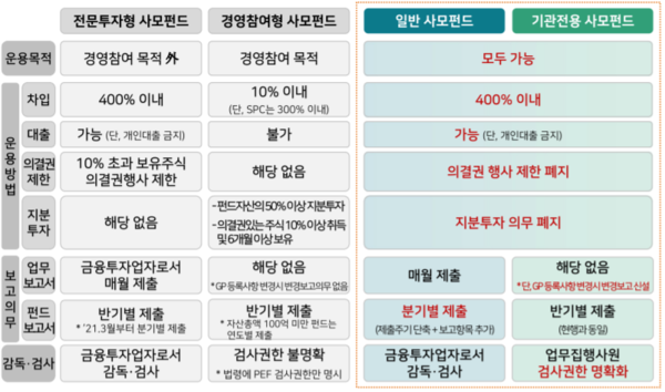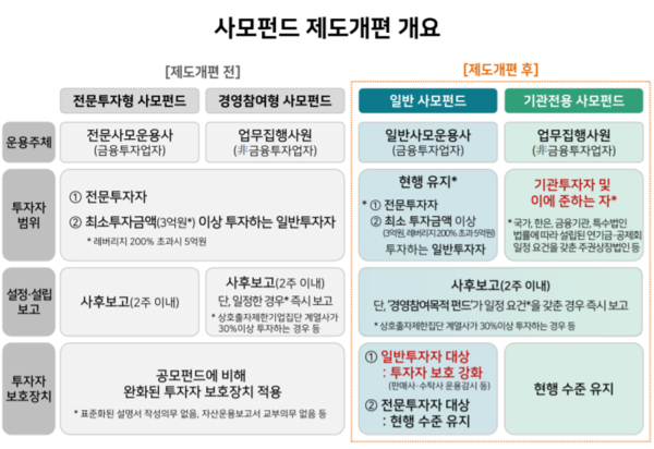 개정된 자본시장법·시행령에 따르면 기존 투자목적에 따라 전문투자형 사모펀드와 경영참여형 사모펀드로 나뉘던 방침을 투자자를 기준으로 '일반 사모펀드'와 '기관전용 사모펀드'로 개편된다.