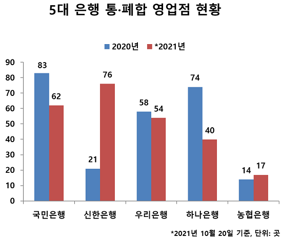 신한은행이 76곳을 통·폐합 확정하면서 가장 많았고 KB국민은행이 62곳, 우리은행과 하나은행이 각각 54곳과 40곳이었다. NH농협은행이 17곳으로 가장 적었다.