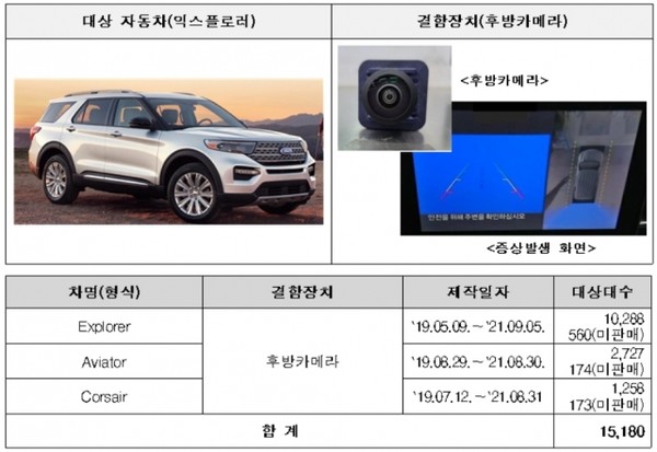 21일 국토교통부는 포드세일즈서비스코리아에서 수입, 판매(판매이전 포함)한 익스플로러 등 3개 차종 15만180대가 후방카메라 시스템 오류로 후진 시 후방카메라의 화면이 디스플레이에 표시되지 않아 후방 차량과 충돌할 가능성이 발견됐다고 알렸다.