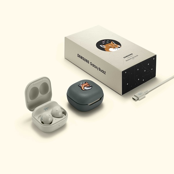 블루투스 이어폰 '갤럭시 버즈2 메종키츠네 에디션'도 공개됐다. 문락 베이지 색상 이어버드와 메종키츠네 폭스 헤드 로고가 새겨진 스타더스트 그레이 색상 가죽 충전 케이스로 구성됐다.