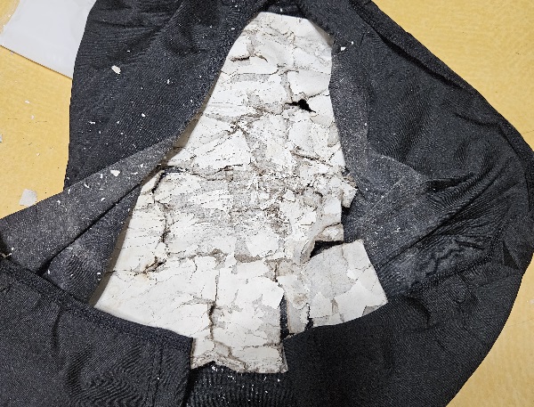 옷 포장 시 반듯하게 모양을 잡으려고 속에 넣어둔 종이 지지대가 삭아 부스러지며 떨어졌기 때문이다. 알 수 없을 정도로 제조일이 오래되거나 보관하며 엉망으로 관리해 문제가 생긴 것으로 보였다.