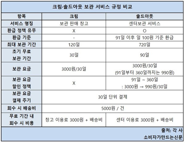 크림은 첫 30일간 무료로 제공하며 솔드아웃은 첫 90일을 프로모션 기간으로 두고 무료로 보관할 수 있도록 하고 있다. 회수 신청 시 반품 배송비 5000원이 별도 부과되며 환급되는 금액은 없다.