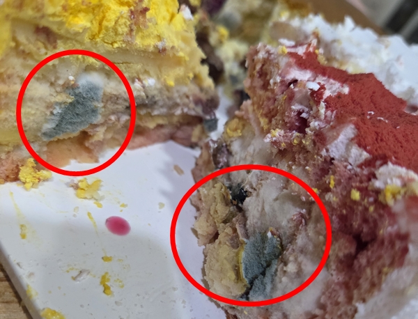 정 씨에 따르면 매장에서 케이크를 사 와 냉장보관한 뒤 가족이 모두 모인 밤 12시경 먹기 시작했다. 케이크 외관이 마른 상태라 의아해도 한 입 떠 먹었는데 '맛'이 이상했다고. 함께 한두입 먹은 가족 모두 '맛'을 지적해 케이크를 살피다 안쪽에 곰팡이가 가득핀 것을 발견했다.