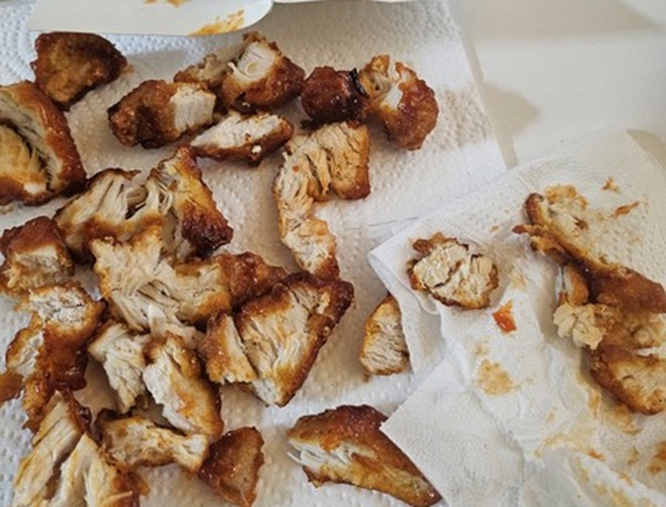 먹다 보니 식감이 퍼석한 데다 형태도 닭다리보다는 닭가슴살에 가까웠다. 임 씨가 판매처에 문의하자 처음에는 본사에서 보낸 재료고 다리살이 맞다고 설명했다.