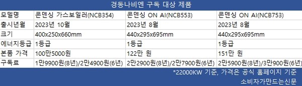8년 기준 월 구독료는 △콘덴싱 가스보일러 NCB354 1만9900원 △콘덴싱 ON AI NCB553 2만2900원 △콘덴싱 ON AI NCB753 2만5900원이다.