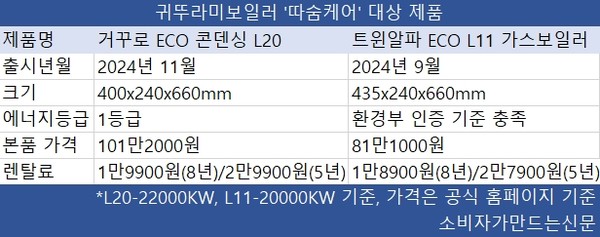 귀뚜라미보일러는 지난 7월 보일러 렌탈 서비스 '따숨케어'를 출시했다. △고급형(귀뚜라미 거꾸로 ECO 콘덴싱 L20 가스보일러) △ 일반형(귀뚜라미 트윈알파 ECO L11 가스보일러) 등 2종을 따숨케어로 이용할 수 있다. 구독 기간은 5년 또는 8년으로 나뉜다. 최저 구독 기간이 경동나비엔보다 1년 적으며 구독 기간 내내 무상 AS가 제공된다.