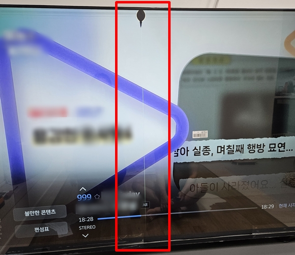경기 안산에 사는 변 모(여)씨는 지난 7일 대형마트에서 산 TV를 직접 설치한 후 켜자마자 액정 가운데 흰 줄이 생긴 것을 발견했다. 상단에는 무엇인가에 찍힌 것처럼 액정이 검게 변한 상태였다.