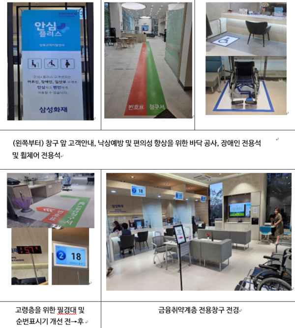 금융취약계층을 위한 전용 대면창구도 신설했다. 삼성화재는 고령층 소비자의 대면 서비스 이용 비중이 높은 점을 고려해 8월부터 서울 강북 권역, 지방 광주광역시 등 고령소비자의 이용 빈도가 높은 권역을 지정해 금융취약계층 전담 고객창구를 신설해 운영 중이다. 해당 고객창구엔 고령층을 배려한 ▲자동문과 안전바 설치 ▲바닥 미끄럼지 방지 공사 ▲시니어 전담 응대 텔러 ▲객장 안내직원 배치 등으로 고객경험 제고를 위해 노력을 기울였다.