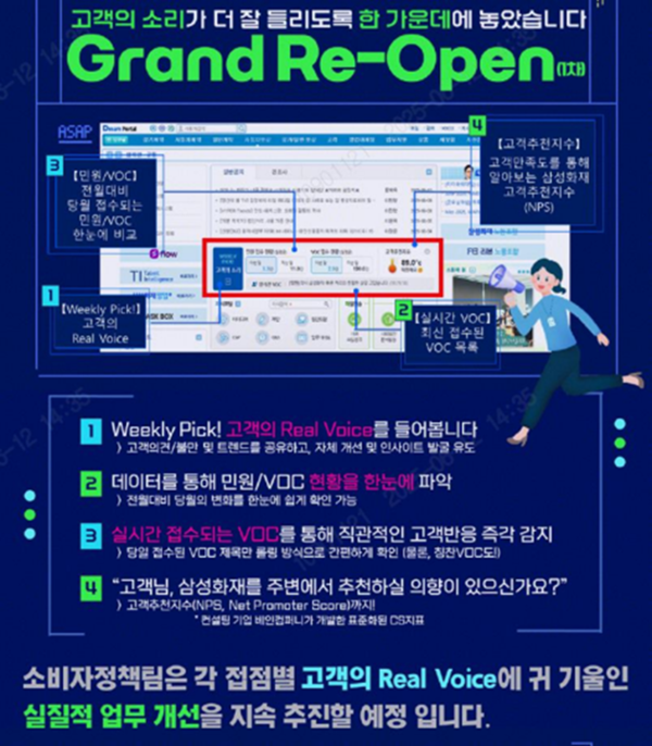 VOC(고객의 소리) 청취 및 개선 노력을 다하고 있다. 삼성화재는 ▲홈페이지 ▲우편 ▲콜센터 ▲모바일 등으로 유입된 고객의 불편·불만과 건의사항 등을 적극 청취하고 24시간 이내 처리한다는 원칙을 바탕으로 신속한 해결에 앞장서고 있다. VOC 시스템을 활용해 분석 결과를 바탕으로 신상품 개발 시 해당 내용을 반영하고 민원 다발부서 등에 대한 CS 교육을 진행하는 데에도 활용 중이라는 점이 특징이다.