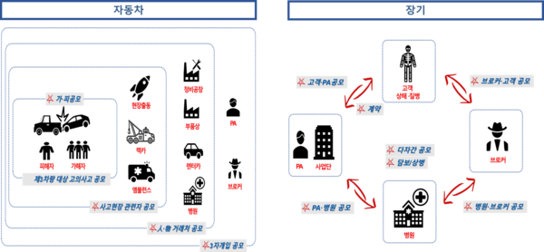 자동차보험의 경우 가해자와 피해자 간 공모 고의사고나 공업사-렉카-부품상 공모 허위청구를 잡아냈다. 장기보험에선 모집인과 병원 간 공모해 환자를 알선하고 유인하는 범죄와 브로커와 병원이 공모해 환자를 알선·유인·허위청구한 사례를 적발했다.