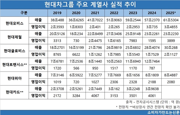 현대모비스는 지난해 처음으로 3조 원대 영업이익을 기록했다. 현대위아와 현대카드도 영업이익 규모가 두 배 커졌다. 반면 현대제철은 수요 둔화와 경쟁 심화로 수익성이 좋지 못하다.