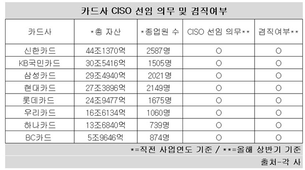 KB국민카드는 박규하 정보보호본부장, 삼성카드는 손영설 정보보안담당 상무, 현대카드 장선영 정보보안실장, 롯데카드 최용혁 정보보호실장 상무, 우리카드 전우영 정보보호본부 상무대우, 하나카드 안중근 개인정보보호부장, BC카드 강대일 정보보호그룹장 상무 등이 CISO를 겸직한다.