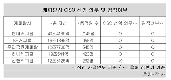 현대캐피탈, KB캐피탈, 우리금융캐피탈, 하나캐피탈, 신한캐피탈 등 주요 캐피탈사 5곳도 IT부문 임원 혹은 준법감시인이 CISO를 겸직하고 있다.