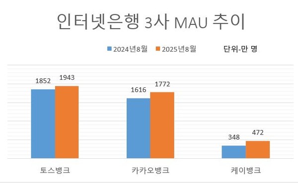 이들이 노리는 MAU와 앱 체류시간도 매년 상승하는 추세다. 모바일인덱스에 따르면 토스뱅크와 카카오뱅크의 MAU는 각각 1943만 명과 1772만 명으로 전년 동기 대비 각각 91만 명과 156만 명 늘었다. 케이뱅크 역시 같은 기간 MAU가 348만 명에서 472만 명으로 124만 명 증가했다.