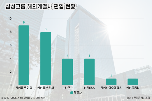 17일 소비자가만든신문이 2020년부터 2025년 4월 말까지 5년간 삼성그룹 해외 계열사 현황을 조사한 결과 편입은 총 71개, 제외는 104개로 집계됐다.